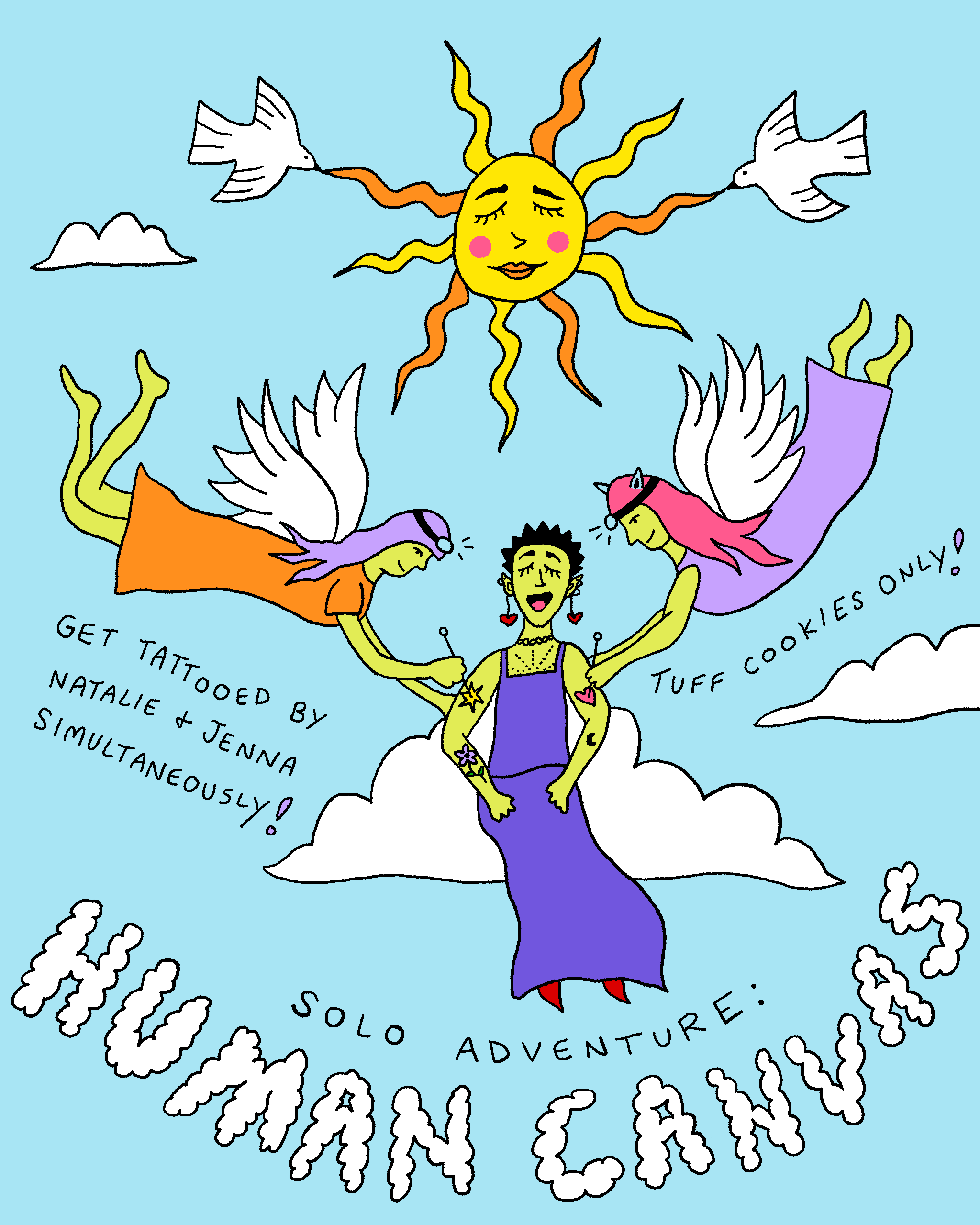 ⁃ You can try out the HUMAN CANVAS experience (shout out to inkmaster lol) where you come solo and get 2 or more tattoos - during this experience you will have the opportunity to get tattooed by me & Jenna at the same time.